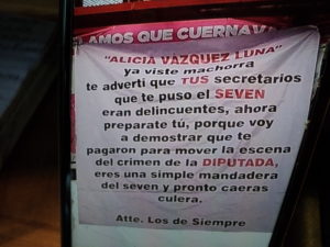 La cartulina amenazadora fue colgada en un puente, y la firma “los de siempre”, mismos que no dan nombres y menos la cara.