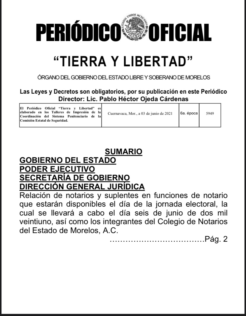 Con el propósito de dar fe pública de algún hecho relevante que pudiera surgir durante la instalación de casillas y el proceso de conteo de votos, se publicó en el Periódico Oficial “Tierra y Libertad”, el listado de notarios titulares y suplentes en funciones, en su caso; así como integrantes del Consejo Directivo del Colegio de Notarios del Estado de Morelos, A.C., que estarán disponibles el día de las elecciones.